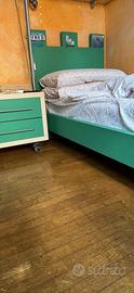 Letto singolo (possibile altro identico) in legno laccato opaco verde erba con 4 ruote, testata sagomata si design, compreso rete a doghe in legno. materasso e piumino in omaggio.