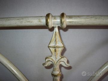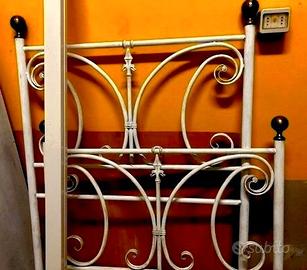 Letto singolo in ferro battuto pesante, colore avorio anticato, completo di testata, pediera, e longheroni laterali. Completo di rete singola normale di cm. 80x190. Se interessa ho anche il materasso.