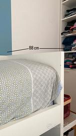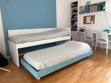 Causa cambio esigenze familiari, vendo bellissimo letto in legno laccato marca Nidi, acquistato circa 7 anni fa presso un noto mobilificio di Pergine Valsugana (TN). Il letto ha una fascia di colore azzurro. Si tratta di un letto doppio, perché il letto estraibile può accogliere un materasso di normale spessore. È estraibile su comode ruote, che si possono anche bloccare. Non presenta segni di usura, tranne una piccola scheggiatura sul lato sinistro. Misure: Lunghezza 206 cm Altezza 94 cm Larghezza 88 cm Entrambe le reti hanno robuste doghe in legno.