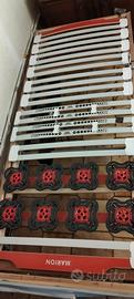 È unarete a doghe motorizzata Marion, un sistema di riposo ortopedico avanzato progettato per offrire un supporto ergonomico e personalizzabile.a rete è realizzata con un telaio inlegno di faggio, noto per la sua robustezza e flessibilitàÈ dotata di un meccanismo elettrico che permette l'alzata indipendente della testa e dei piedi. Questo sistema è azionato da un telecomando.A mmortizzatori in 3D:La parte superiore (zona spalle) presenta supporti rossi e neri con tecnologia a piattelli (oscillanti) per una migliore accoglienza della spalla. compreso di Materazzo