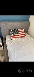 Vendo letto singolo, recentemente rivestito con ottimo tessuto idrorepellente e relativo materasso delle dimensioni 90cm X 195 cm. Doghe in legno. Usato pochissimo, ottime condizioni.