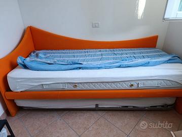letto singolo con seconda brandina a cassetto che al bisogno si apre per diventare letto matrimoniale. Colore arancio, completo di entrambi i materassi in buone condizioni, vendo per passaggio ad altro arredamento, ad EUR 30,00 trattabili. Trasporto a vostro carico. Primo contatto a mezzo SUBITO. L'articolo si trova a Marcelli di Numana (AN).