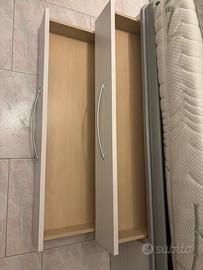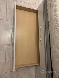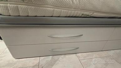 Letto singolo, struttura in legno bianco, con 4 cassetti. Rete a doghe .