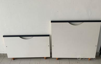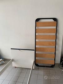 Vendo letto singolo completo di rete a doghe larghe in legno misura 80x190 . Colore bianco con bordi superiori neri. Il letto è già smontato in singoli pezzi pronti per il trasporto.