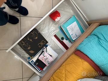 Vendo pratico e robusto letto singolo in stile moderno, ideale per camerette o stanze degli ospiti. Il design bicolore combina il calore del legno chiaro con una base bianca pulita, adattandosi a ogni tipo di arredamento.