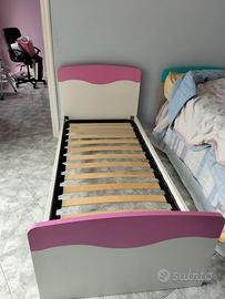 Vendo letto singolo firmato Mondo Convenienza (linea Romeo), caratterizzato dal design moderno con testiera e pediera a onda bicolore (bianco e rosa/malva). Il set è completo e pronto all'uso, ideale per la cameretta di una bambina o ragazza. Include: Giroletto: struttura robusta e ben tenuta. Rete: a doghe in legno, integra e senza cigolii. Materasso: incluso nel prezzo