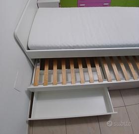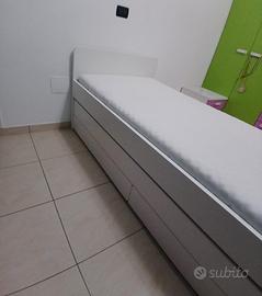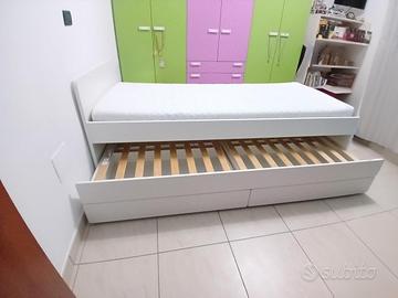 2 letti a una piazza uniti insieme + materasso per letto principale e 2 cassetti contenitore .
