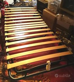 Letto singolo pieghevole con telaio in acciaio blu, rete a doghe in legno, materasso in gommapiuma e tessuto, il materasso misura m. 1,75x0,82 e cm. 10 di spessore, la rete misura m. 1,84x0,80 e richiuso ha uno spessore di cm. 35.