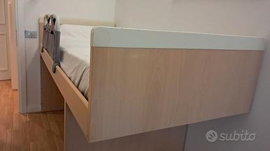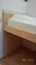 letto singolo in ottimo stato completo di rete a doghe e materasso in lattice. iI pratico spazio sottostante, H 75cm , è utile per camerette poco spaziose da utilizzare come spazio giochi o per riporre oggetti.
