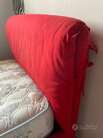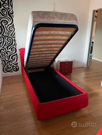 Letto singolo rosso con testiera di stoffa. Apribile per riporre oggetti dentro. Ritiro in loco. Senza materasso.