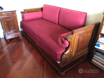 Letto stile impero a barca singolo (misure 198L x 85 P x 76 H) comprensivo di seduta e cuscini (come in foto). In regalo il comodino.