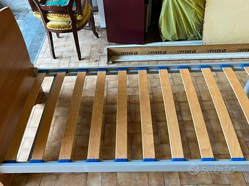 Letto singolo a doghe struttura in acciaio , testata in legno , 2,00 x 90. H 35 da terra , completo di materasso e cuscino , praticamente come nuovo . Non spedisco , e non accetto offerte , il prezzo e quello esposto .