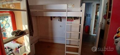 Letto rialzato a circa 1,20 da terra. Ideale per bambini dai 6 ai 12 anni. Consente di occupare lo spazio sottostante con mobili e cassettiere.