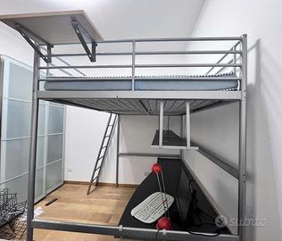 Vendo letto a soppalco IKEA matrimoniale, colore argento. Inclusi nel prezzo, materasso in lattice, sottomaterasso e una scrivania con mensole dello stesso modello (solo il materasso in lattice vale oltre 200 euro).