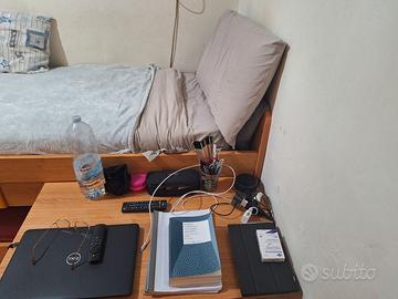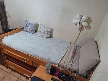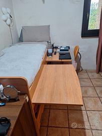 Letto a soppalco con 2 scrivanie estraibili, 4 cassetti, venduto comprensivo di materassi, colore legno chiaro e arancione. Sono compresi, scaletta e barra di sicurezza. Lungo cm 206, altezza spalliera cm 107, largo 89, scrivanie aperte profondità cm 54. Smontaggio e ritiro a carico dell'acquirente. Prezzo trattabile