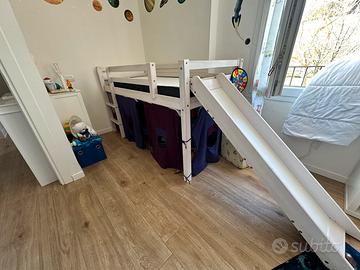 Vendo letto a soppalco/gioco con tende e scivolo (amovibile). Completo di materasso a misura nuovo. Ottimo stato, come da foto. Misure 188x87x107h senza scivolo. Ritiro a carico acquirente