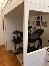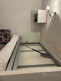 Letto Lops arredi bianco e rosa singolo con meccanismo di ribalta per facilitare il rifacimento del letto compreso piano bianco per scrivania, mensola rosa sopra la scrivania e armadio . Nella foto scrivanie mensola sono smontate.Scaletta in metallo. 90x200 h 130/180