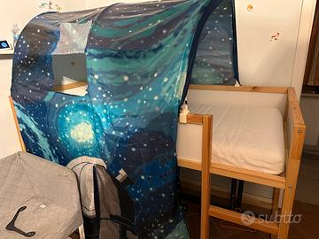 Vendo letto sopraelevato,marca Ikea,conpleto di materasso e tenda come da foto. Due anni di vita,ottime condizioni. Vendo da smontato. Ritiro a mano