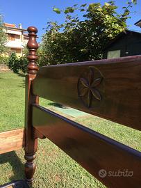 Letto matrimoniale stile spagnolo in legno massello epoca anni ‘70. I torciglioni si possono togliere. Molto solido e ben tenuto. Bello così o da dipingere tinta unita. Si trova a Padenghe sul Garda