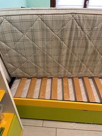 Letto standard dimensioni 200x90cm, completo di materasso memory alta qualità made in Itali sfoderabile, secondo lettino pieghevole con materasso standard, mai usato.. Possibilità di vendita separata. Il materasso era costato 5 anni fa 680 €, il letto è di ottima qualita', ma il sostegno di una doga deve essere riparato, in quanto una vite ha sognato la sede. Nel letto è presente la barriera anticaduta amovibile coordinata col letto, non presente in foto.