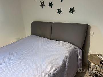 Vendo letto stilfar matrimonlale lungo 210 cm largo 180 cm. Testata imbottita in due cuscini separati e squadrati. Giroletto arrotondato nella parte frontale . Piedini cilindrici in metallo a vista.