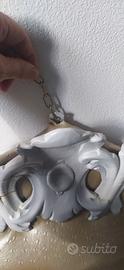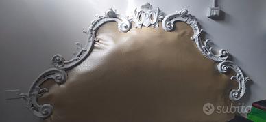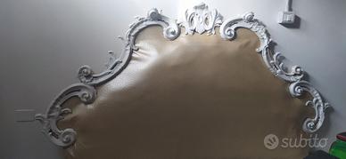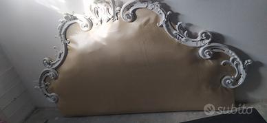 Antica testiera per letto, intagliata a mano, originale del 1800, foderata con pelle di struzzo color perla, lunga 2 metri e alta 1,18. Ha il gancio per essere appesa al muro, ma può anche essere appoggiata a terra. Stupendi intagli di foglie, riccioli e fiori di alto antiquariato