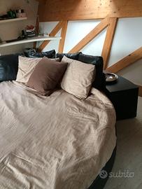 letto tondo diam. 240 cm, con rivestimento in pelle completo di rete, mobile testata basso sagomato in legno rovere tinto Venghè ad uso comodino completo di cassetti comodino e ampio vano portaoggetti posteriore.