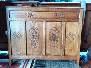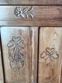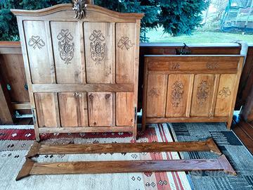 Letto in legno massello di castagno, fatto a mano da artigiano,con intarsi decorativi eseguiti a mano.