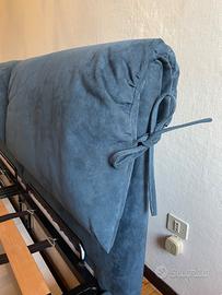 Letto contenitore matrimoniale in tessuto Alcantara. Completamente sfoderabile. Rete con doghe in legno. Colore: blu navy Dimensioni rete: 190 cm x 160 cm