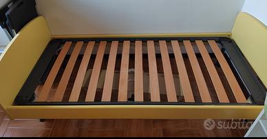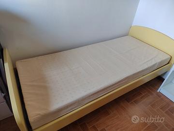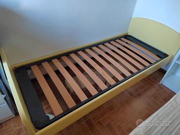 Letto singolo con rete con doghe in legno, come in foto. Ottima qualità, solo leggermente usurato. Struttura in legno. Misure struttura: 202 cm x 90 cm x 67 cm (altezza massima). Venduto con o senza il materasso che si vede in foto. Comodino 2 cassetti coordinato, dimensioni 45.5 cm (larghezza) x 47 cm (profondità) x 42 cm (altezza). Letto e comodino non vengono venduti separatamente. No consegna, solo ritiro a mano (smontato). Contattare solo se davvero interessati a comprare. .