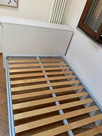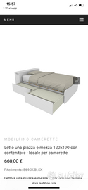 Letto una piazza e mezza 120x190 con contenitore in testata (h 90 cm), in ottime condizioni usato pochissimo, bello e robusto. Come nuovo, presenta solo un lieve graffio sulla base di appoggio all’interno (quindi non visibile).