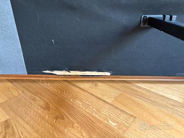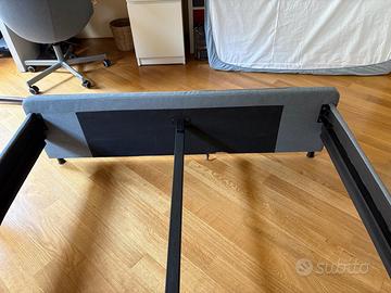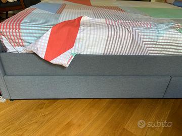 Letto una piazza e mezza, completo di testiera, pediera, struttura portante porta materasso. Imbottito in stoffa di colore grigio con 4 cassettoni a scomparsa. Non sono compresi doghe in legno e materasso.