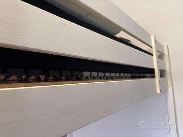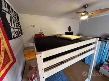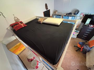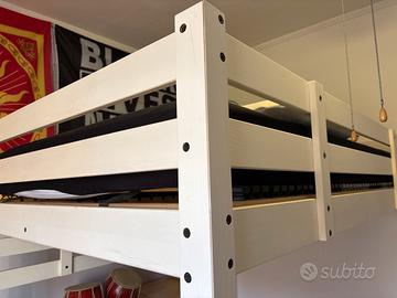 Letto Ikea con soppalco. Misure esterne 213 × 152 × 214 di altezza. Misura del materasso 190 x 40. Materasso e doghe in ottime condizioni. Dotato di un sistema di controllo delle zone di pressione delle doghe. Completo di scaletta attualmente non utilizzata e non presente nelle fotografie. Altre fotografie e informazioni su richiesta. Il letto presenta quattro buchi di ancoraggio perché è stato fissato alla parete per aumentare la stabilità e la sicurezza.