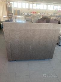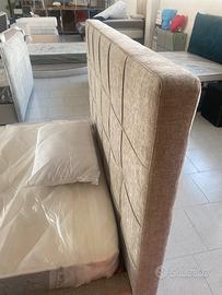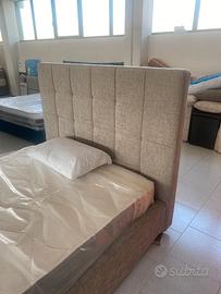 Letto ad una piazza e mezzo completo di rete a doghe di faggio, predisposto per materasso da 140x200. Tastiera capitone, giro letto completamente sfoderabile. Piedino piastra in acciaio. Tessuto anti macchia idrorepellente. Possibile da visioanre in azienda