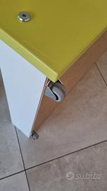 Letto verde per bambini con materasso 80x180 e doghe in legno con sponda rimovibile e cassettone estraibile.