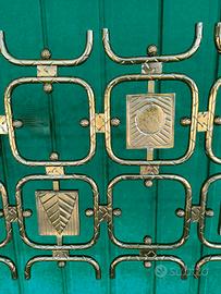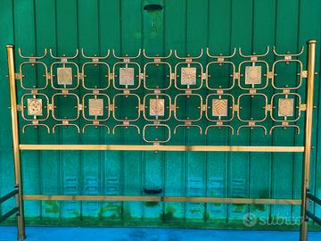 Struttura in ottone lucido, testiera decorata con 9 formelle a bassorilievo in fusione di ottone con decori differenti di Arnaldo e Giò Pomodoro.