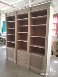libreria in LISTELLARE RICOPERTO ESSENZA MDF IDONEO PER il LACCATO e LEGNO DI TOULIPIER PER CORNICI ZOCCOLO E SPALLETTE misure lunghezza 270 h 270 prof. 45 in 3 vani uguali, sotto zoccolo h 10 cm modanato e capitello applicato, piedini livellatori all’interno nascosti per mettere a bolla il tutto, vano sx e dx si aprirà su cerniere da cucina regolabili ammortizzate in chiusura con pomello, telaio ante con pannello interno fissato su relativi listelli, all’interno ripiano aggiustabile su cremagliera e relativo listello, sopra nei (3 vani a giorno) disposti 12 ripiani aggiustabili e nel vano centrale sotto 4 cassetti su guide ammortizzate. 4 spallette rigate incise unghiettate sui montanti verticali cappello h 15 cm e capitelli con cornicette modanate, schienale posteriore 8 mm in mdf idoneo per essere laccato. finitura laccata verde opaco liscio. mobile è stato prodotto su commissione ma possiamo riprodurlo. iva non comprendente direttamente produttore. astenersi commercianti