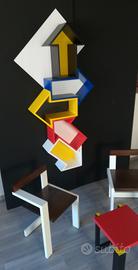 5 moduli libreria di dimensioni 41x51x21cm a forma di freccia in legno multistrato di betulla con laccatura poliuretanica. Moduli che possono assumere varie composizioni in base alla scelta desiderata. Colori in stile Mondrian per renderla versatile in qualsiasi ambiente e renderlo originale e di grande impatto visivo. Può essere posizionata a terra o a sospensione, ogni modulo possiede sul fondo staffe per fissare al muro per un ancoraggio in sicurezza. Saranno inviati tasselli e viti di fissaggio e tappi copri viti dello stesso colore del fondo posteriore. Montaggio molto intuitivo e semplice. Ottime condizioni. Solo ritiro.