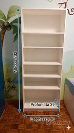 Vendo pratica libreria bianca con 6 ripiani spaziosi, ideale per organizzare libri, giocattoli o documenti. II mobile è in ottime condizioni generali, solido e pronto all'uso. Perfetto per una cameretta (come in foto), studio o soggiorno. Dimensioni esatte (come da foto con misure): Altezza: 202 cm Larghezza: 80 cm Profondità: 39 cm I ripiani intermedi sono regolabili in altezza per adattarsi alle tue esigenze. Prezzo: 40 Euro Ritiro: Non effettuo spedizioni. È disponibile esclusivamente per il ritiro a mano a Veduggio/Cassago.