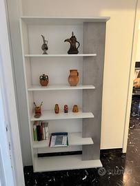 Vendo libreria a muro di design moderno, finitura elegante in legno bianco opaco con inserti effetto cemento grigio.