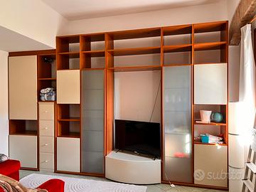 Libreria a muro in legno in condizioni molto buone. Dotata di due ante a vetrina con rispettive mensole in vetro. Cassettone centrale. Possibilità di installare illuminazione a faretti nella parte centrale. Smontaggio e trasporto a carico dell’acquirente.