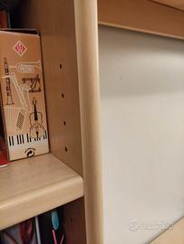 Libreria a ponte in laminato faggio posformato con ripiani spostabili. In ottime condizioni. Basi con frontali in anilina verde. Scrivania (144 x 59) in laminato faggio con bordo frontale in legno massello posformato.