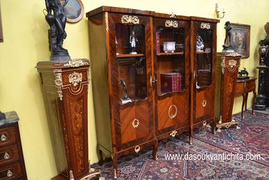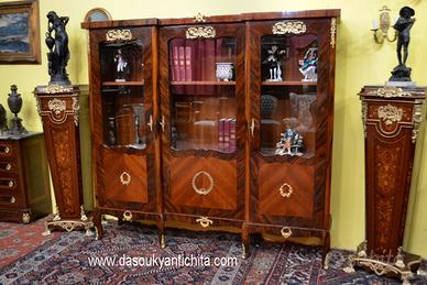 Elegante libreria- cristalliera stile Napoleone III lastronata in palissandro con un motivo a spina di pesce sulla parte frontale e laterale, presenta tre sportelli in vetro con la parte centrale sporgente, dove all’interno troviamo ampi ripiani ,arricchita da elementi in bronzo a motivo forma di ghirlanda d’alloro , fogliaceo con calzini in bronzo sapientemente cesellati.