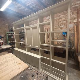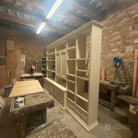 Libreria a vista con ripiani, casetti e sportelli verniciati di bianco di legno masello. Misure lunghezza 330 cm * altezza 247 cm * profondità 52 cm. In perfette condizioni.