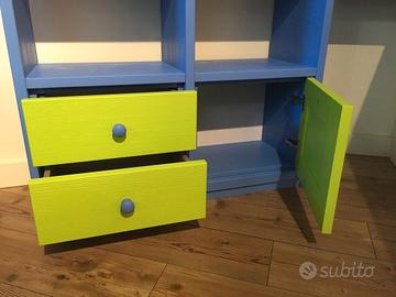 libreria realizzata interamente in abete, colore blu oltremare e lime, con vani a giorno, doppio cassetto e anta