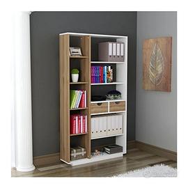 Libreria in laminato dotata di schienale di finitura, eventualmente rimovibile. Completa di due cassetti porta-cancelleria. Sollevata da terra tramite piedini.