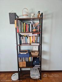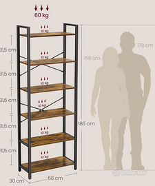 Libreria alta stile industriale, ideale per libri, piante o oggetti decorativi. Profili metallici in colore nero e mensole finto legno marrone vintage. Misure: 30×66×186