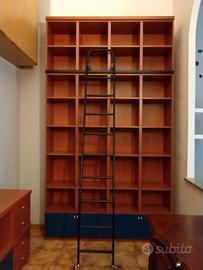 Libreria di colore ciliegio e blu, dotata di un elemento aggiuntivo per sfruttare l'altezza. È provvista di binario guida e scaletta in metallo con ruote e freno.