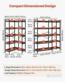 • Venditori Affidabili di Esperienza • Spediamo ovunque, anche in Contrassegno • Vendiamo solo articoli Nuovi di prima qualità • Contattaci per qualsiasi info necessaria Opzioni di montaggio flessibili: questa libreria angolare offre due opzioni di montaggio: a L e dritta, consentendo di posizionarla in modo flessibile in diversi spazi. Il design verticale a più livelli offre ampio spazio per vari oggetti Materiali di alta qualità: realizzati in resistenti pannelli in MDF e robusto metallo, i ripiani rinforzati sono spessi 1,5 cm e la struttura in metallo è rinforzata 2 cm, garantendo che ogni ripiano possa sostenere fino a 91 kg di peso Struttura stabile e sicura: le barre a X forniscono ulteriore supporto e stabilità all'intero ripiano, evitando la caduta dei libri Dispositivi antiribaltamento: include dispositivi antiribaltamento a cinghia e a ventosa, compatibili con diversi tipi di pareti, come piastrelle, legno e cemento Facile da montare e da pulire: nota: a causa delle condizioni di illuminazione e delle diverse impostazioni dei dispositivi di visualizzazione, potrebbero verificarsi lievi variazioni di colore tra il prodotto reale e quello reale