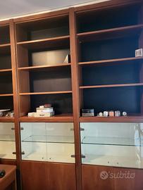 Libreria angolare modulare fine anni '80, realizzata da Pessina Design , con parti a giorno e parti chiuse con ante cieche e in vetro. Impiallacciatura noce tanganica con elementi di raccordo verticale tra i moduli in massello. Ottime stato.